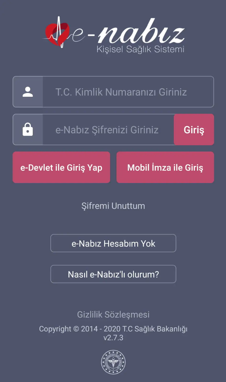 Uygulamayı indirdikten sonra bu ekran bizi karşılıyor. Burada eğer ilk kez uygulamaya giriş yapacaksak “e-nabız hesabım yok “ seçeneğini seçiyor ve ardından “şifre oluştur” diyoruz.