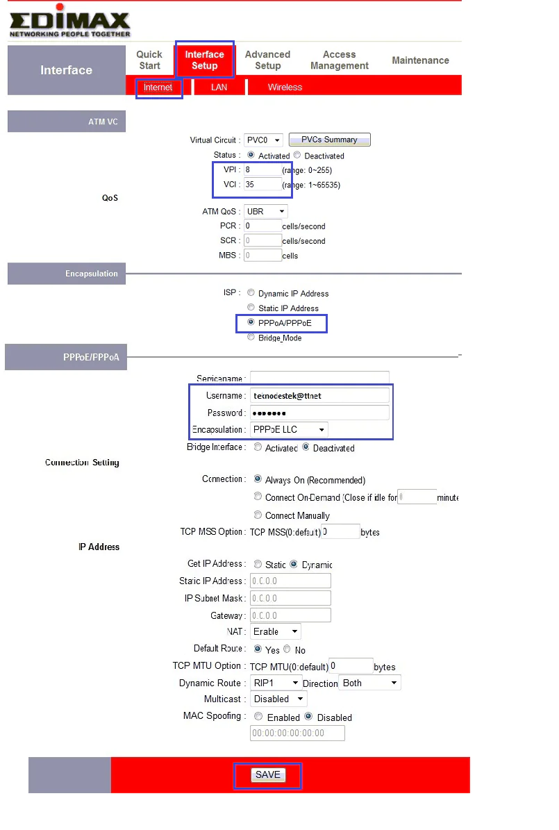 - Açılan sayfada “VPI – VCI” değerleri “8/35”; “Encapsulation” seçeneği PPPoA/PPPoE işaretli ise “Username”(Kullanıcı adı) ve “Password”(Password) kutucuklarına, servis sağlayıcınızın (ISS) verdiği kullanıcı adı ve şifreyi yazarak “Save”(Kaydet) butununa tıklıyoruz.