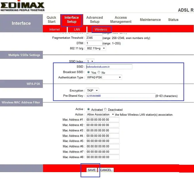 - Kablosuz ağ ayarları için de istediğiniz değişikliği yaptıktan sonra “Save”(Kaydet) butonuna tıklayınız. Artık modem web arayüzünde tüm işlemleri tamamlanmış olup, kablolu ve kablosuz olarak internetini kullanabilirsiniz.