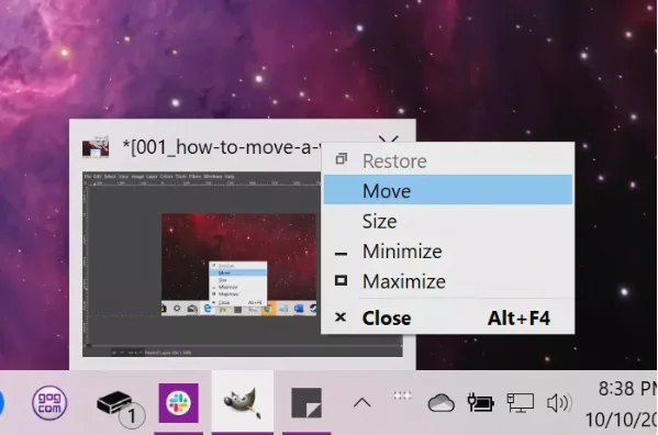 - Eksik pencereyi görüntülenebilir alana taşımak için Sol Ok veya Sağ Ok tuşunu kullanın. Ayrıca, eksik pencere işaretçinize yapışırken farenizi hareket ettirebilirsiniz.