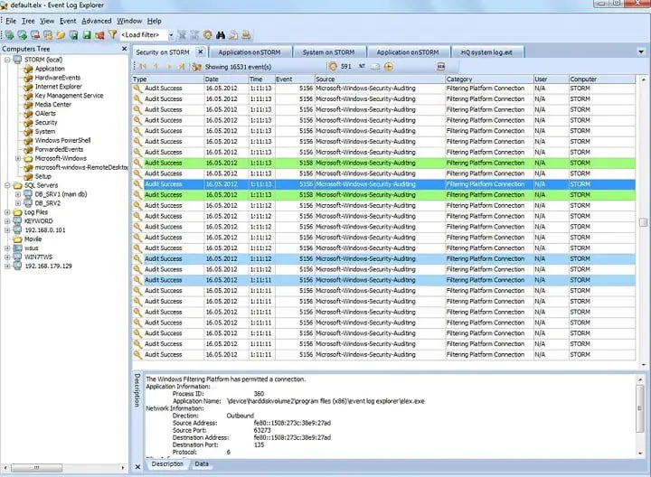 • Olay günlüklerine anında erişim – Olay Günlüğü Gezgini hem yerel hem de uzak olay günlükleriyle ve aynı zamanda EVT ve EVTX biçimindeki olay günlüğü dosyalarıyla çalışır.