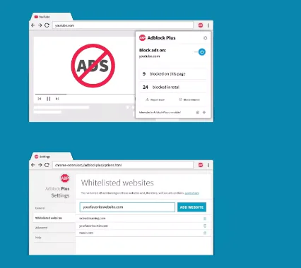AdBlock Plus (ABP), Firefox, Chrome, Safari, Edge ve Opera için kullanılabilen uzantılarla en popüler reklam engelleyicileri arasındadır. ABP, kullanıcıların çoğu reklamı hızlı bir şekilde engellemesine olanak tanıyan önceden ayarlanmış filtre listelerinin yanı sıra kötü amaçlı yazılımları ve sosyal medya düğmelerini filtreleme seçeneği sunan hızlı bir kurulum sunar.
