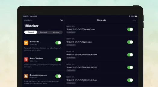 1Blocker X, 115.000’den fazla engelleyici kural, özel bölgesel reklam engelleme ayarları ve kullanımı kolay özel kural ayarları içerir. Uygulama, uygulama içi satın alımlar olarak sunulan premium özelliklere sahip ücretsiz bir indirmedir.