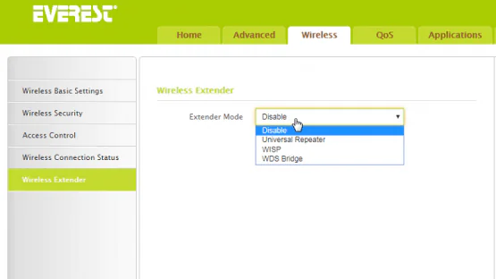 • Sayfanın sol kısmında Wireless Extender seçeneğine tıkladıktan sonra açılan bölümde Extender Mode seçeneğini Universal Repeater olarak seçiyoruz.