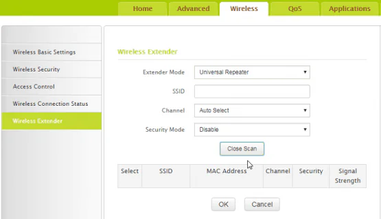 • Daha sonra alt kısımda çıkan Close Scan bölümüne tıklayınız. Alt bölümde kablosuz (Wi-Fi) ağ isimlerinin olduğu bir liste gözükecektir. Ana modemimiz TP-Link 9970’in kablosuz ağ adını işaretleyip OK seçeneğine tıkladığımızda ayarları kaydedecektir.