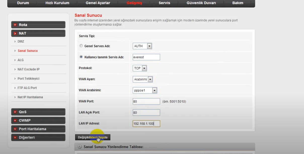 fotoğrafta görüldüğü şekilde kısımları dolduruyoruz port kısımlarına açmak istediğiniz port numarasını giriceksiniz diğer kısımlarda resimdekiyle birebir aynı şekilde yapıyorsunuz değişiklikleri uygula butonuna tıkladıktan sonra ayarların kaydolması açısından modemi kapatıp açıyoruz.