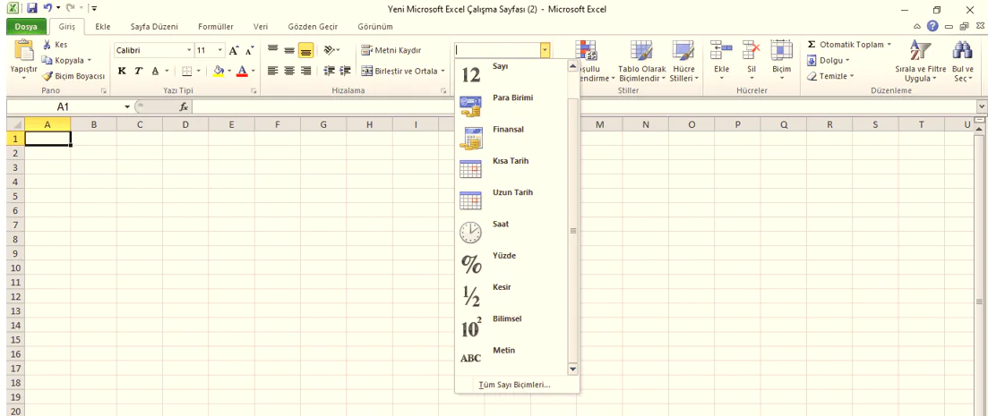 Sayı içeren bir hücre seçip Giriş şeridi sekmesindeki Sayı biçimlendirme menüsüne tıklayın. Sayı biçimlendirme menüsünde çeşitli biçimlendirme seçenekleri görünür. Şimdi bu seçenekleri sırasıyla inceleyelim.