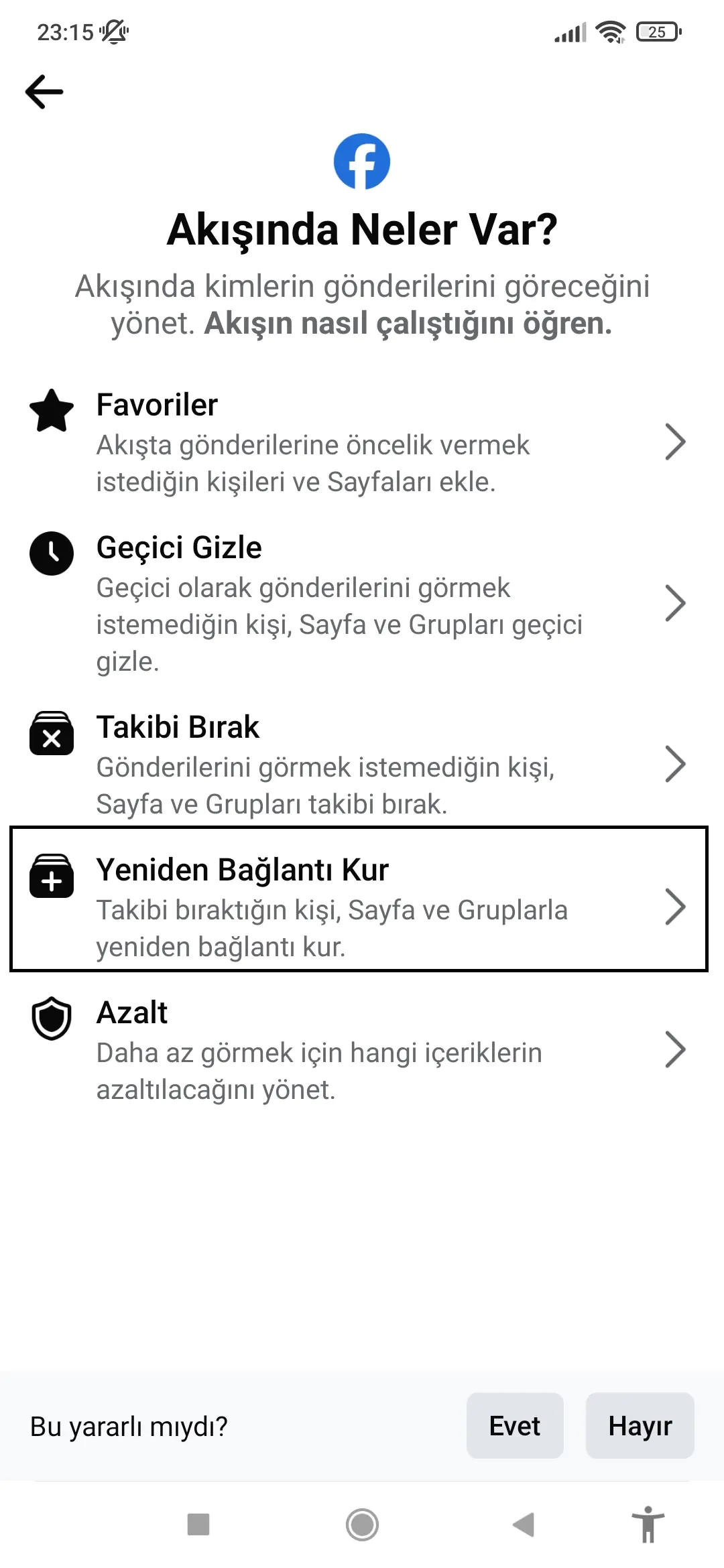 İlginizi çekmeyenleri takipten çıkardıktan ya da erteledikten sonra, ilginizi çekenlerle tekrar bağlantı kurmak iyi bir fikir olabilir. Bu, geçmişte takipten çıkardığınız Facebook profillerini tekrar takip etmeyi de içerir. Bunu yapmak için şu adımları izleyin: