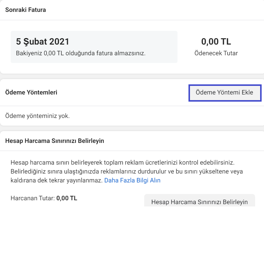 - Faturalandırma seçeneğine tıkladıktan sonra gelen menüde ‘Ödeme Yöntemi Ekle‘ seçeneğine tıklayalım.