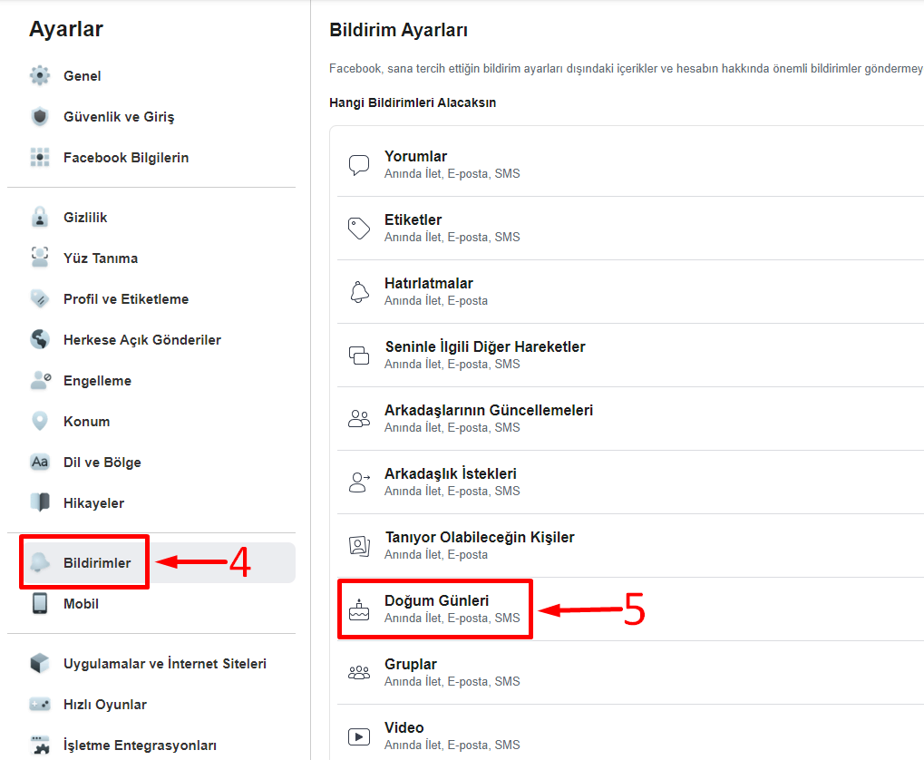 - Daha sonra ise açılan ekranlarda bulunan Bildirimler menüsünden Doğum Günleri alt alanına tıklıyoruz.