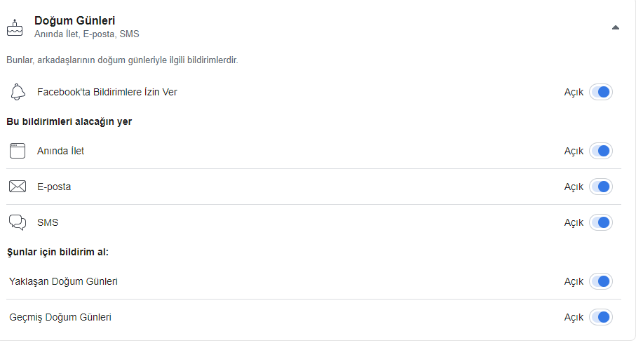 Facebook Doğum Günü Bildirim ayarları menüsünden bildirimleri aktif konuma getirebildiğimiz gibi aynı zamanda aynı alanın alt menülerinden bu tür bildirimleri deaktif konuma getirmemiz de mümkün.