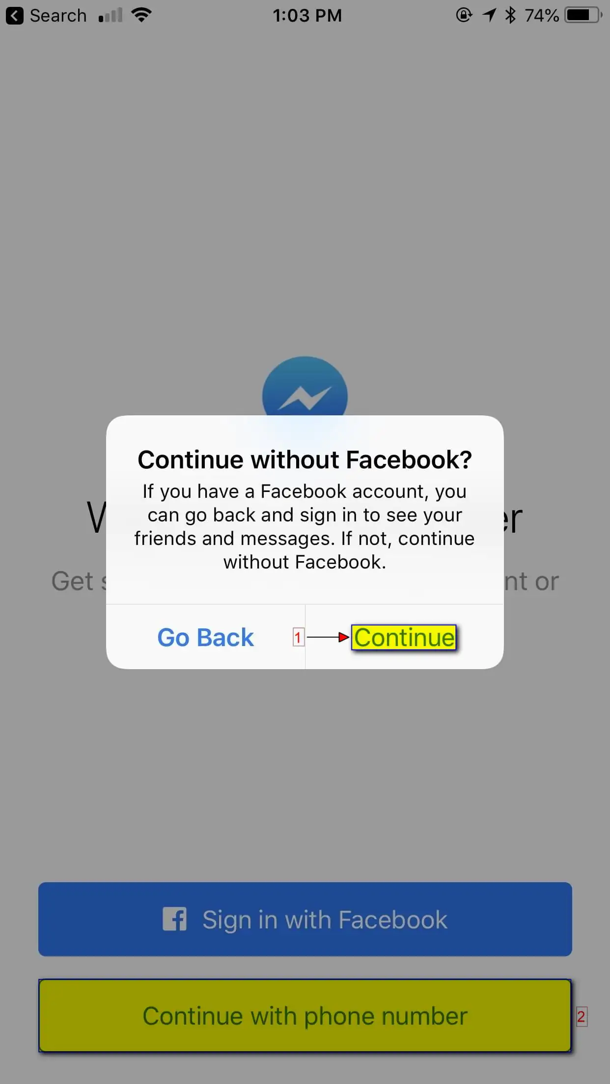 Başlamak için, cihazınızda Facebook Messenger uygulaması yüklü değilse yükleyin ya da uygulamayı kaldırın ve Android, iOS linklerinden indirip yükleyin ve daha sonra uygulamayı açın. Cihazınızda bir Facebook hesabı yok ise (kayıtlı değil ise), ‘Facebook ile Giriş Yap (Sign in with Facebook)’ ve ‘Telefon numarası ile devam et (Continue with phone number)’ seçeneklerini göreceksiniz. İkinci seçeneği seçin.
