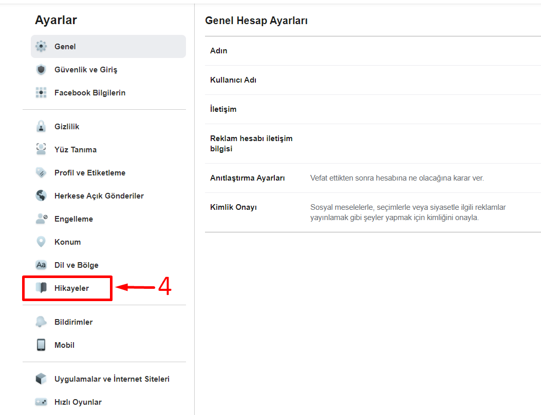Bir sonraki ekrandan ise açılan ayarlar ekranında bulunan Hikayeler menüsüne giriyoruz.