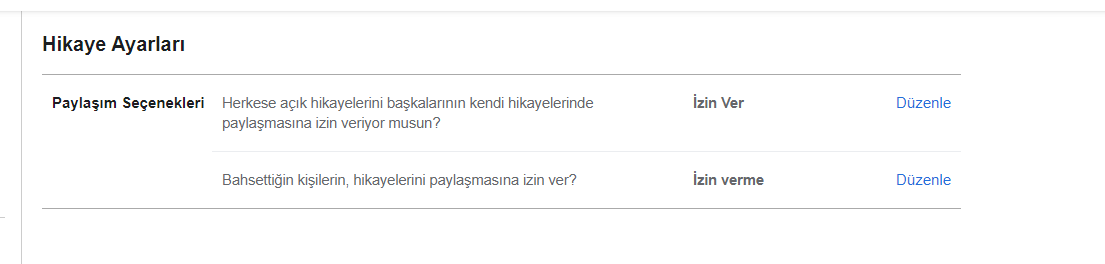 Son olarak ise açılan Hikaye Ayarları bölümünden Paylaşım Seçenekleri‘ni dizayn edebiliyoruz. Bu alan bulunan seçenekleri İzin Ver veya İzin Verme olarak konumlandırabiliyoruz.