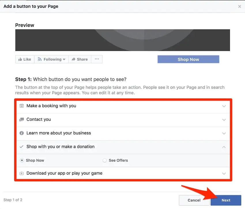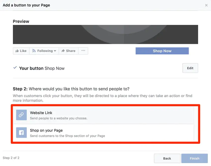Ardından, web sitenize bağlantı vermek veya müşterileri, Facebook sayfanızın Mağaza (Shop) bölümüne yönlendirmek için bu butonu kullanabilirsiniz.