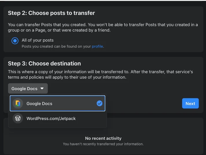 Facebook artık kullanıcıların metin gönderilerini ve notlarını Google Dokümanlar, Blogger ve WordPress.com’a toplu olarak aktarmalarına izin veriyor. Daha önce, veri aktarımı özelliği yalnızca Facebook’a yüklenen fotoğraflar ve videolarla sınırlıydı.