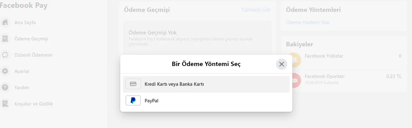 Kayıtlı ödeme yöntemleriniz varsa, bu ödeme yöntemleri hemen Facebook Pay ile kullanılabilecektir.