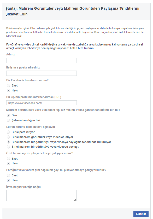 Facebook’ta birisi sizlere mesaj, fotograf, video gibi sizin gizli kalmasını istediğiniz şeyleri paylaşma tehdidinde bulunuyor. Veya sizden bu veriler karşılığında sizden para yada farklı bir şey talep ediyorsa bu durumu öncelikle bulunduğunuz bölgedeki kolluk kuvvetlerine bildirin. Ayrıca bu durumu Facebook ekiplerine detaylı bilgi vererek ilgili verilerin kaldırılmasını yada bu tehdidi yapan kişinin hesabıyla alakalı olarak işlem yaptırabilmektesiniz.Eğer sizde bu durumdaysanız aşağıda ki adımları takip ederek Facebook ekiplerine bildirisini sağlayabilirsiniz.