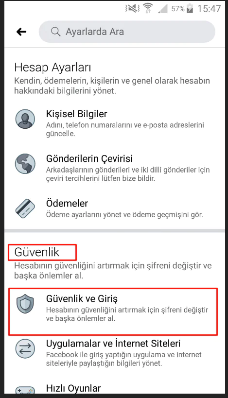 3. Güvenlik ve Giriş‘e tıklayın.