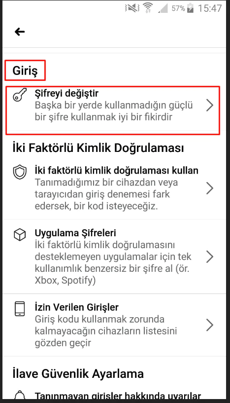 Giriş başlığının altındaki Şifreyi değiştir‘e tıklayalım.