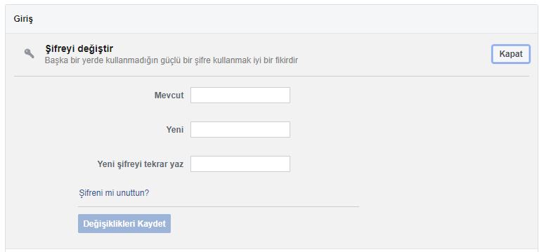 Şifrenizi DeğiştirmeGiriş yapmış durumdayken Facebook’taki şifrenizi değiştirmek için: