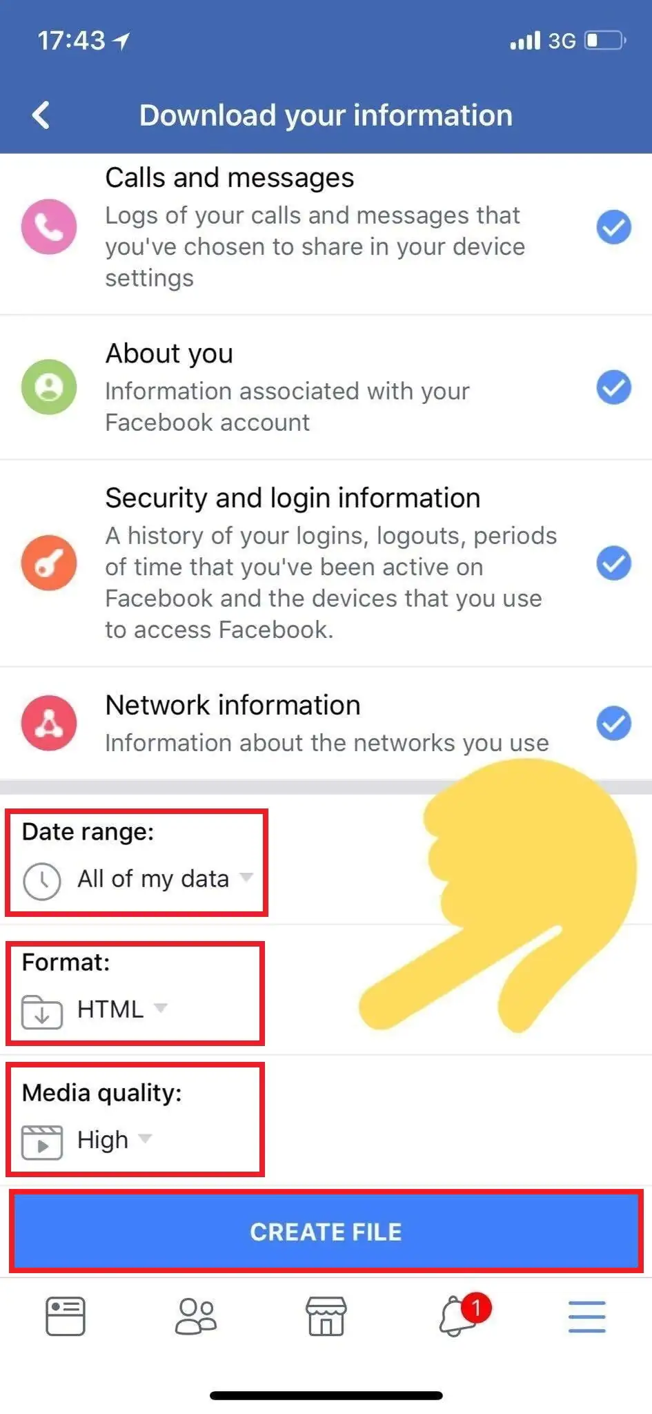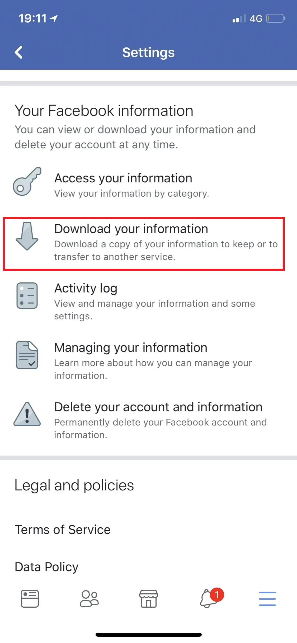 iOS veya Android cihazınızdan Facebook verilerinizi indirebilmek için, cihazınızda güncel (en son versiyon) Facebook uygulamasının yüklü olması gerekiyor. Cihazınızda güncel (en son versiyon) Facebook uygulaması yüklü ise, aşağıdaki adımları takip ederek Facebook verilerinizi cihazınıza indirebilirsiniz.