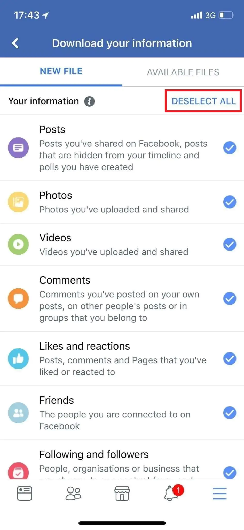 - Gönderiler (paylaşımlar), fotoğraflar (photos) gibi, hesabınıza (profilinize) ait indirebileceğiniz verileri listeleyen ve seçebilmenizi sağlayan sayfa açılacak. Varsayılan olarak tüm seçenekler (veriler) seçilidir. ‘HİÇBİRİNİ SEÇME (DESELECT ALL)’ butonuna tıklayıp, seçilen tüm seçenekleri iptal ettikten sonra, indirmek istediğiniz verileri kendiniz tek tek seçebilirsiniz.