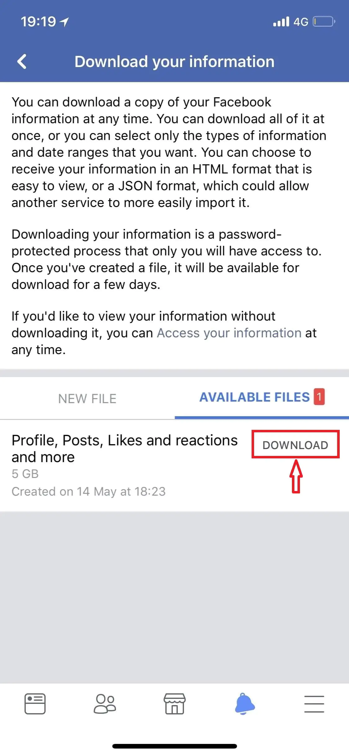 - İndireceğiniz verilerin boyutuna bağlı olarak, dosyanın oluşturulması belli bir süre alacaktır. Dosya oluşturulduktan sonra ‘İNDİRİLEBİLİR (HAZIR) DOSYALAR (AVAILABLE FILES)’ başlığı altındaki ‘İNDİR (DOWNLOAD)’ butonuna tıklayıp, Facebook verilerinizi içeren dosyayı telefonunuza indirebilirsiniz.