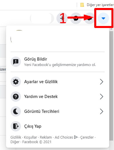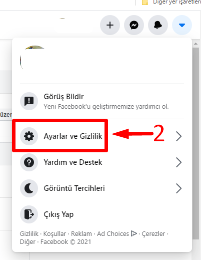 İşlemlerimize Facebook hesabımızda oturum açarak başlıyoruz. Daha sonra sağ üstte bulunan menü tuşuna basarak açılan bölümden Ayarlar ve Gizlilik menüsüne giriyoruz.