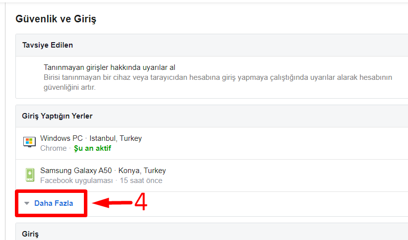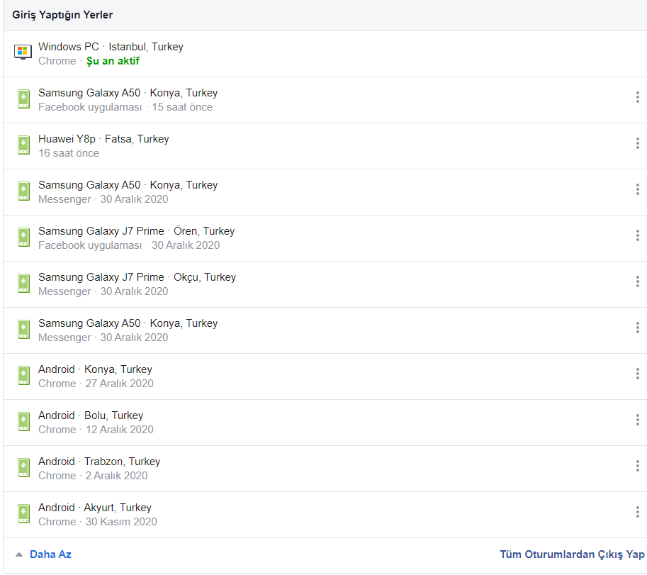 Son olarak karşımıza gelen Güvenlik ve Giriş alt menüsünde bulunan Daha Fazla butonuna basarak geçmişe dönük tüm Facebook sistem giriş konum ve cihaz bilgilerine erişebiliyoruz.