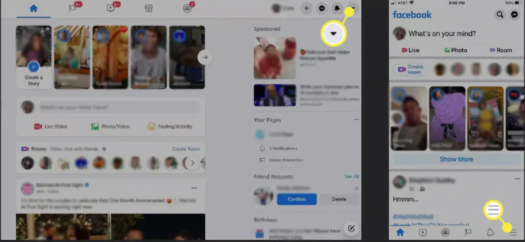 2-Facebook.com’da sağ üst köşedeki aşağı oku seçin. Mobil uygulamada sağ alt köşedeki üç çizgiye dokunun.