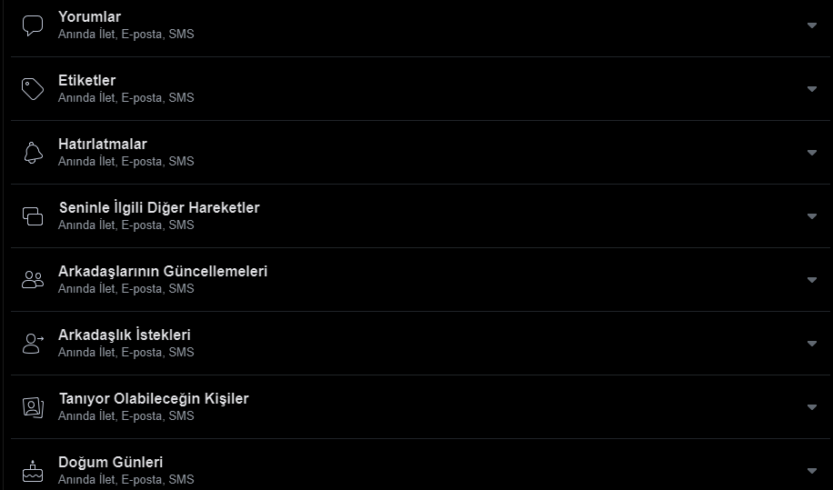 • Etiketler: Bir gönderi veya yorumda sizi etiketlediğinde sizi bilgilendirir.