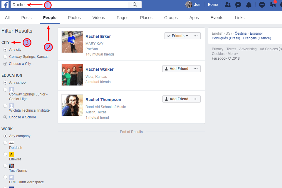 Bu kişinin hangi okula devam ettiğini, hangi işte çalıştığını ya da hangi ortak arkadaş(lar)a (mutual friends) sahip olduğunu biliyorsanız, o zaman bu kişiyi bulmanız daha da kolaylaşır. Bu durumda ‘İŞ (WORK)’ ya da ‘EĞİTİM (EDUCATION)’ menüleri altından, aradığınız kişinin iş veya eğitim bilgilerini seçebilir veya ‘ORTAK ARKADAŞLAR (MUTUAL FRIENDS)’ menüsü altından ortak arkadaş(lar)ınızı seçebilir ve böylece arama sonuçlarınızı daraltabilir ve aramanıza daha yakın sonuçlar elde edebilirsiniz.
