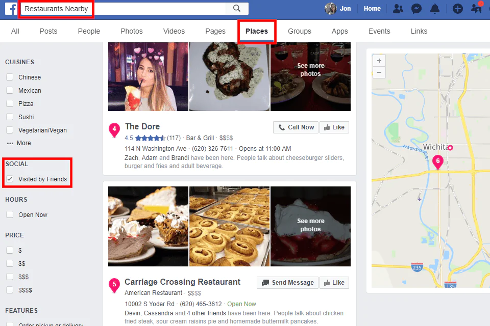 Facebook’ta, yakınınızdaki restaurantları arayabileceğiniz gizli bir restaurant arama aracı vardır. Hatta arkadaşlarınızın Facebook’ta beğendiği restaurantları bile görebilirsiniz (bulabilirsiniz).
