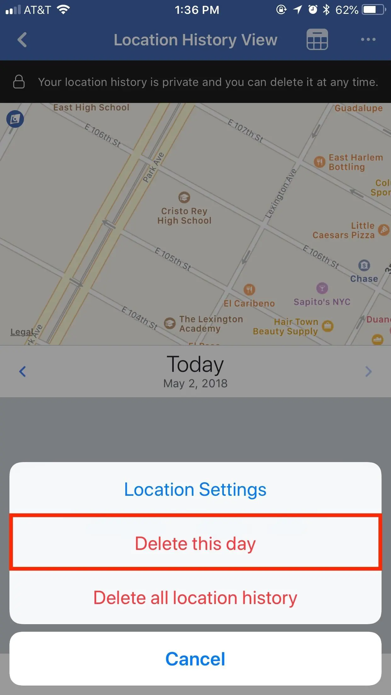 Facebook’un artık konum bilgilerinizi (verilerinizi) kaydetmesini istemiyorsanız, (öncelikle) kaydedilmiş konum verilerinizi silin. Herhangi bir güne ait konum verilerinizi silmek istiyorsanız, takvimden o günü seçin.
