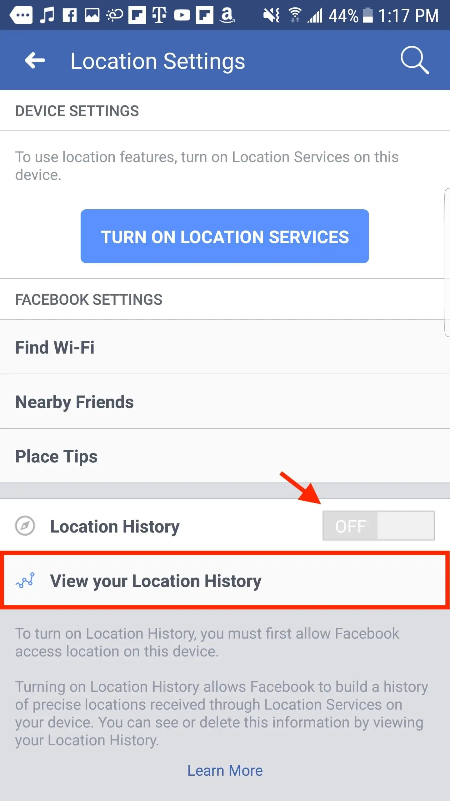- Konum Geçmişi (Location History) özelliğinin (servisinin) açık olup olmadığını kontrol edin. Tercihinize göre, bu özelliği (servisi) kapatabilir veya açabilirsiniz. Bu servisi etkinleştirdiyseniz veya geçmişte etkin olduğundan kuşkulu iseniz, Facebook’un sizi nereden takip ettiğini görmek için Konum Geçmişinizi Görüntüleyin (View your Location History) menüsüne dokunun.