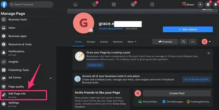 - Gelen sayfada soldaki kenar çubuğu menüsünü aşağı doğru kaydırın. Daha sonra Sayfa Bilgilerini Düzenle (Edit Page Info) menüsüne tıklayın.