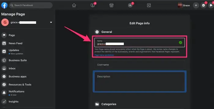 - Açılan sayfanın üst kısmında bulunan Genel (General) başlığı altında yer alan; Ad (Name) metin kutucuğuna tıklayın. Ve daha sonra Facebook sayfanız için yeni bir isim girin.