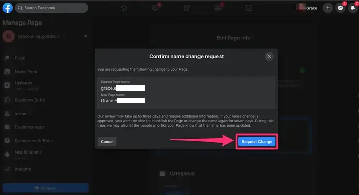 Facebook‘un, sayfanız için isim değişikliği talebinizi onaylaması üç gün kadar sürebilir.
