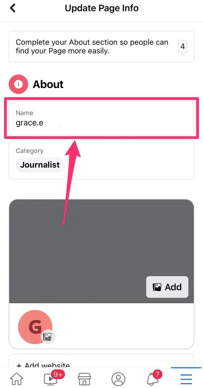 - Gelen ekranda en üstte yer alan Hakkında bölümünde, Ad (Name) alanına dokunun. Daha sonra, sayfanızın yeni ismini yazın ve ardından Devam (Continue) butonuna dokunun.