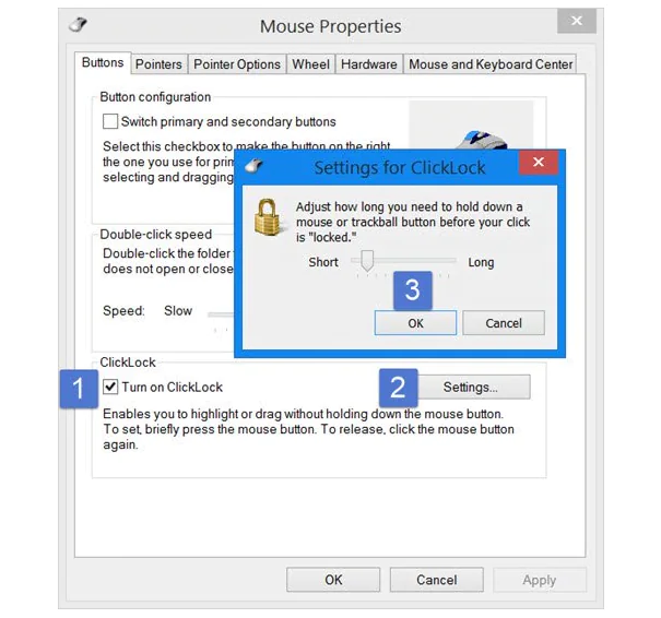 Kilitle’yi açmak için, Kontrol panelini açın ve ardından Fare Özellikleri’ni açmak için Fare’ye tıklayın. Düğmeler sekmesinin altında, ClickLock’u göreceksiniz.