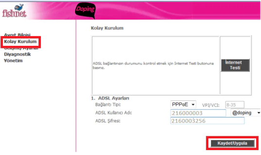 - Kolay kurulum sayfasında, size servis sağlayıcınız (Doping, TTNet, Smile, Vodafone, D-Smart, Superonline, gibi) tarafından verilmiş ADSL kullanıcı adı ve ADSL şifrenizi yazalım.