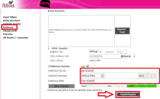 - Kablosuz ağ adı ve şifre belirlendikten sonra Kaydet/Uygula yapılarak gerekli işlemler tamamlanacaktır.