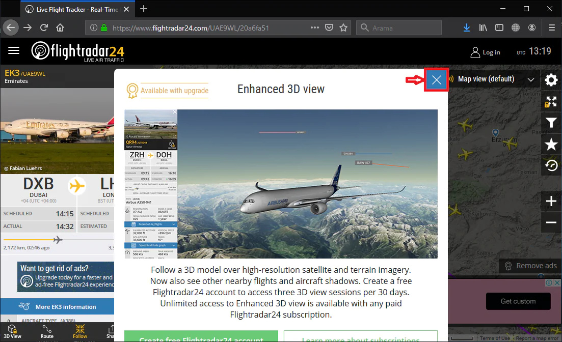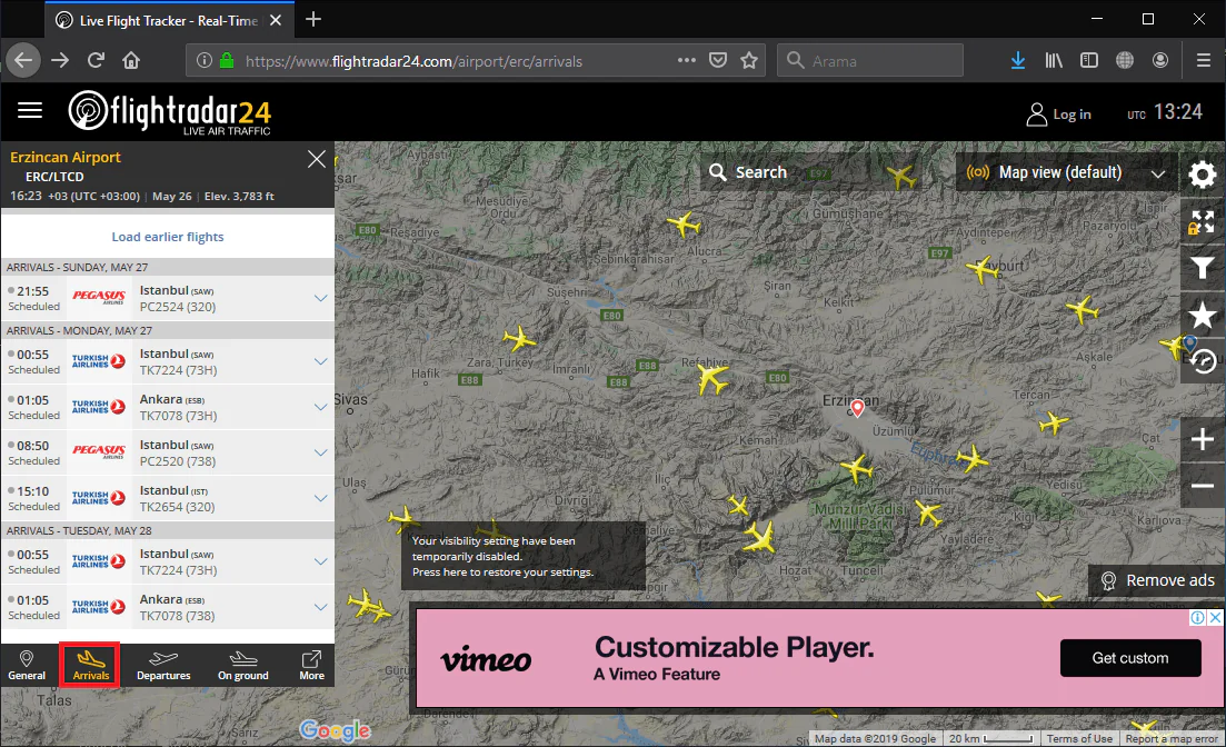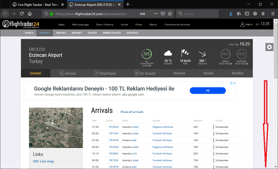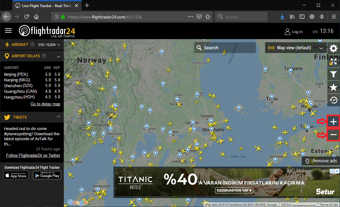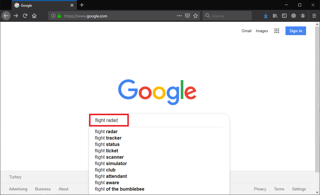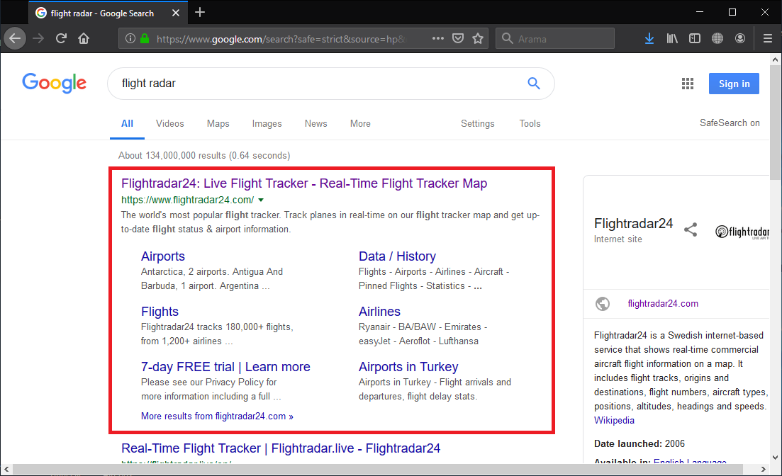 • Çıkan arama sonuçlarından https://www.flightradar24.com/ linkine tıklıyoruz ve sayfaya giriş yapıyoruz.
