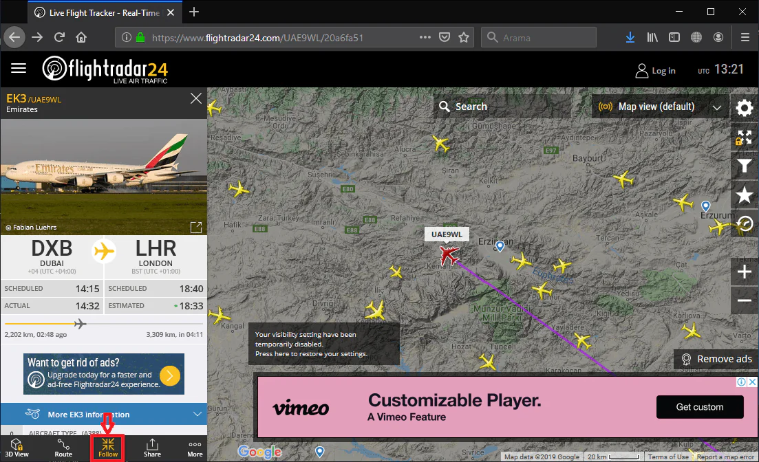 • ‘Follow’ sekmesine (menüsüne) tıklayarak, o uçağın güzergahı üzerindeki yolcuğunu (hareketini) anlık olarak takip edebilirsiniz.