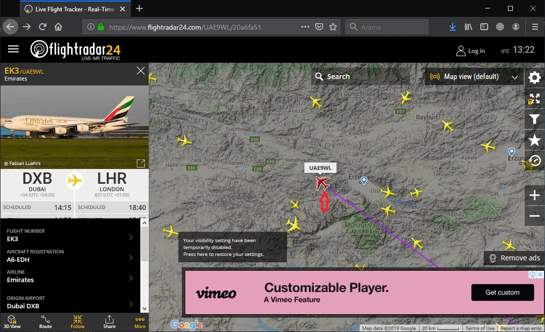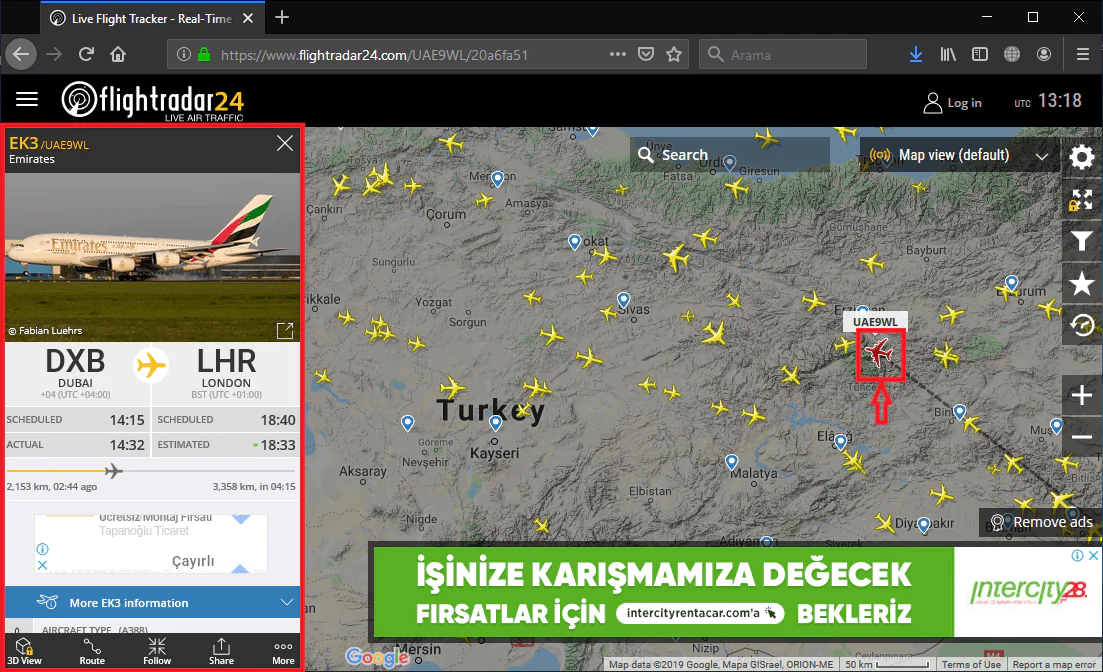 • Harita üzerinde herhangi bir uçağın üzerine gelerek uçuş bilgisini görüntüleyebilirsiniz.