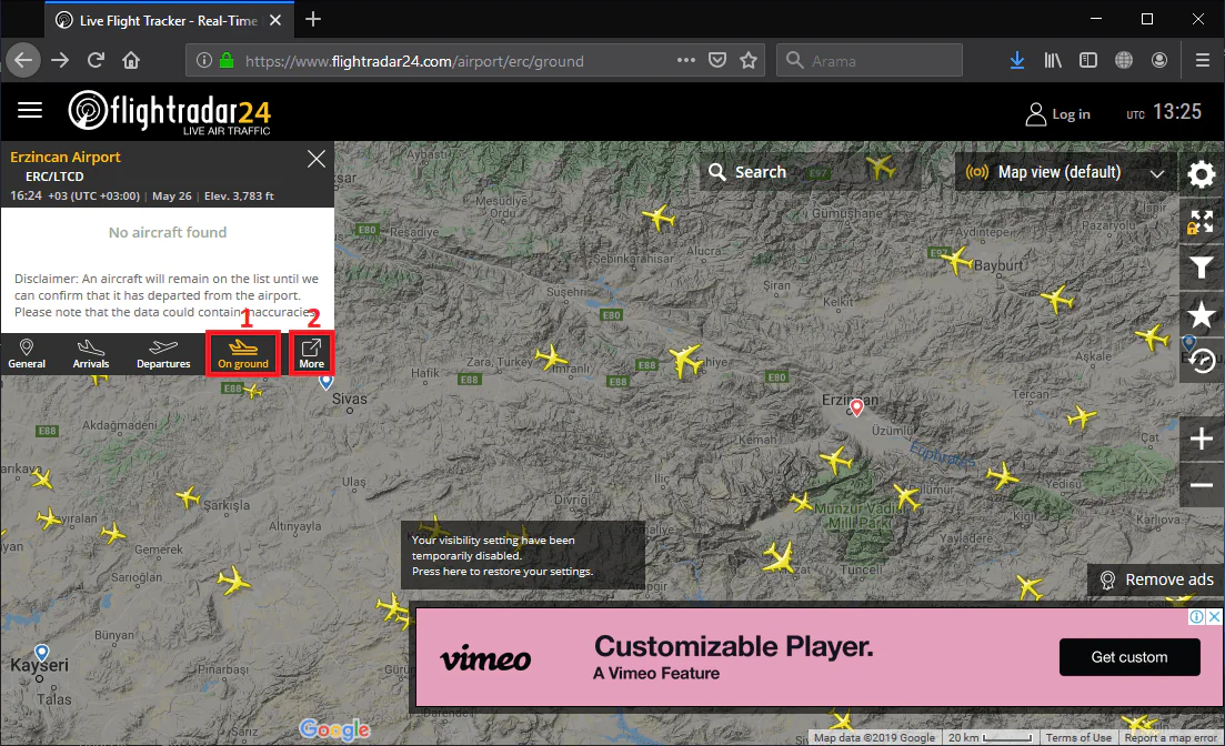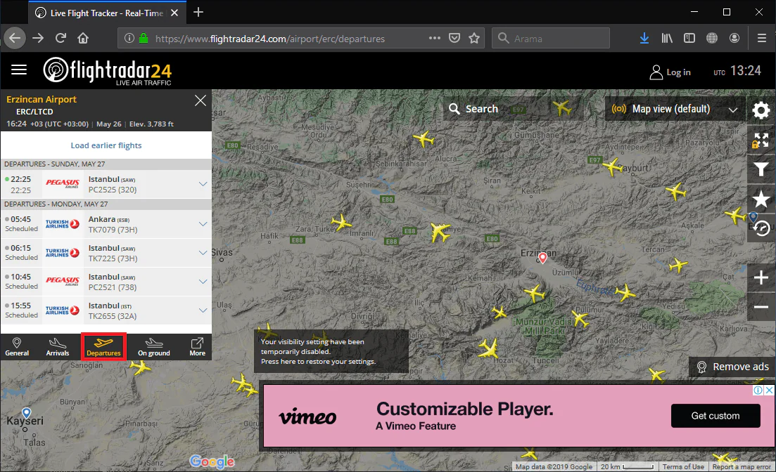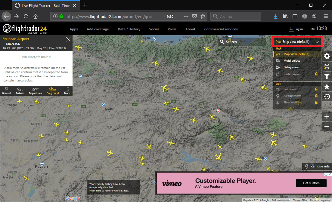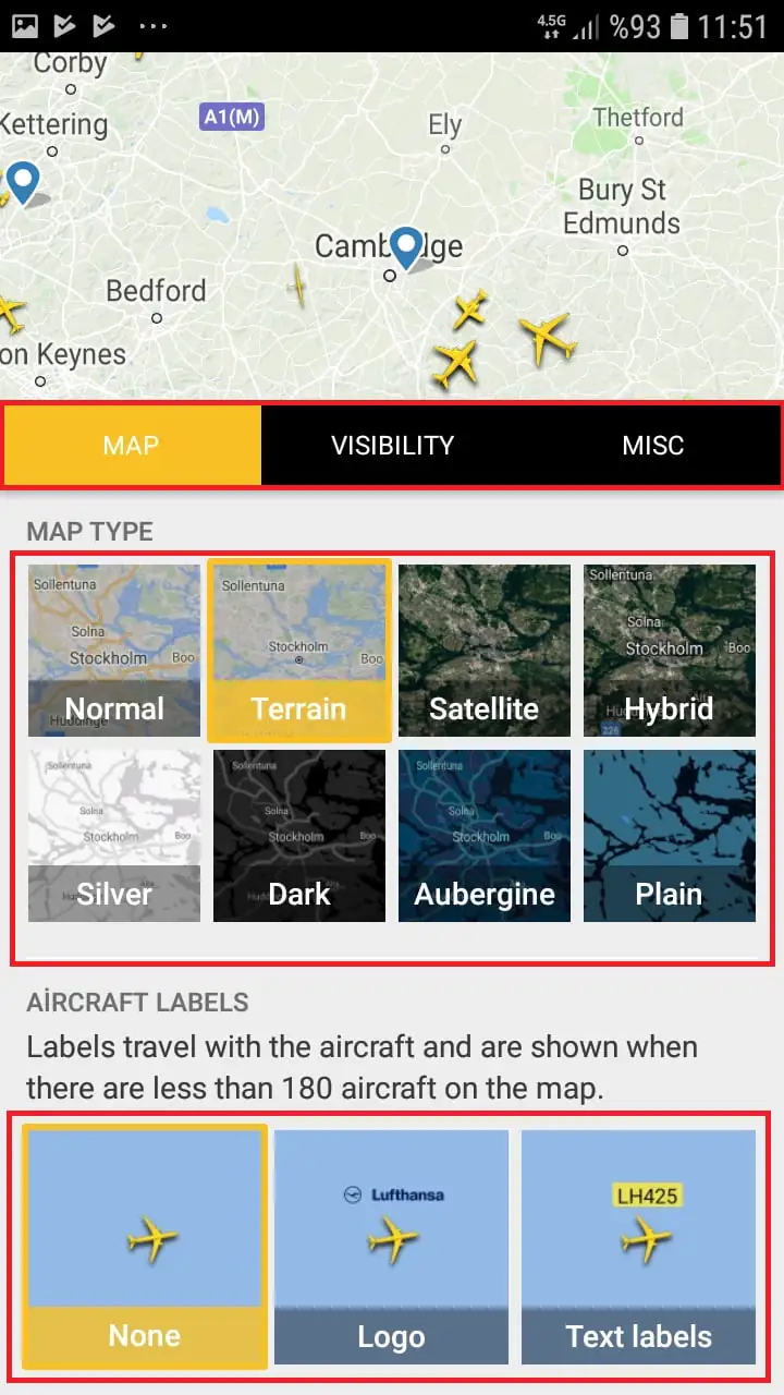 • Harita üzerinde açılan ayarlar panelinde harita tipini, uçak simgesi tipini değiştirebilir; görünürlük ayarlarını düzenleyebilirsiniz.