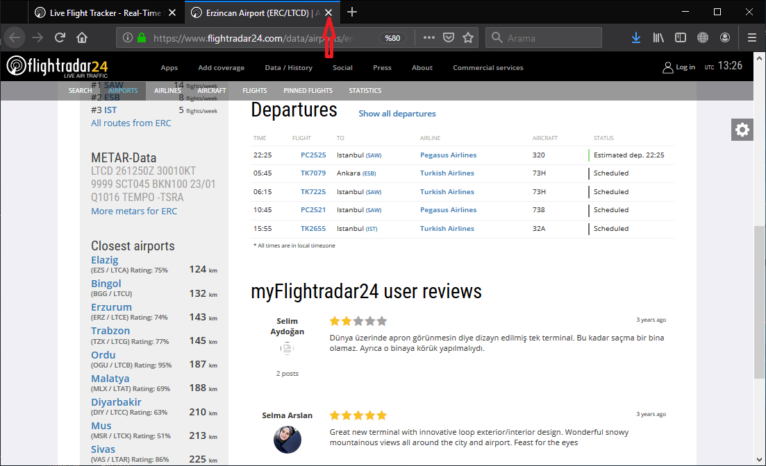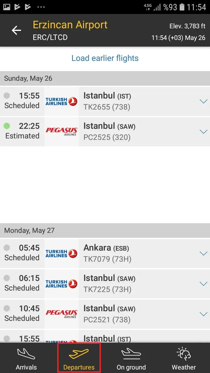 • ‘Departures’ sekmesinden (menüsünden) ise, o havaalanından yapılan gidiş seferlerini (kalkan seferleri) görüntüleyebilirsiniz.