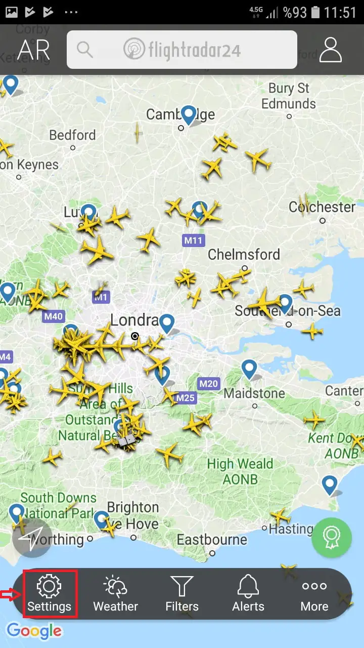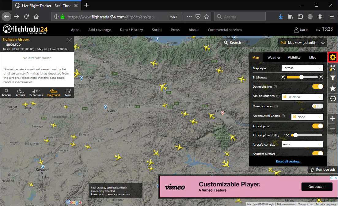 • Dişli-çark (⚙ ) simgesine tıklayıp ‘Map’, ‘Weather’, ‘Visibility’ ayarlarını düzenleyebilirsiniz.