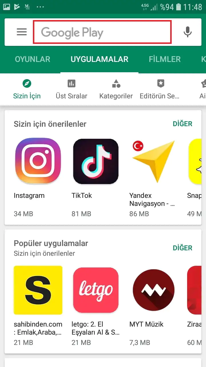 • Google Play Store (veya App Store) uygulama marketine giriş yapıyoruz.